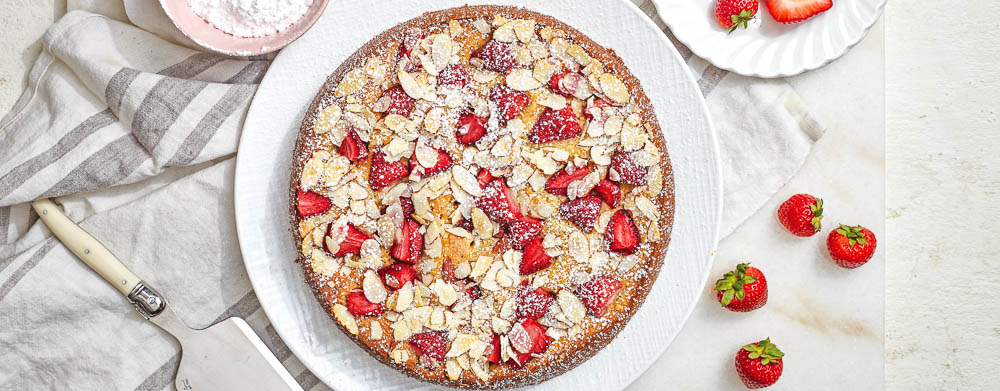 A finishing touch of sugar-coated sliced almonds gives this sweet berry-topped cake a tempting crunch.