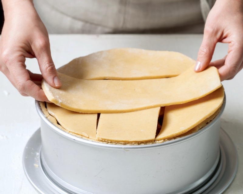 After you’ve filled crust with cooled apple mixture, place dough strips parallel and spaced ¼ inch apart over mixture. Repeat with remaining strips, arranging over and perpendicular to first set of strips.