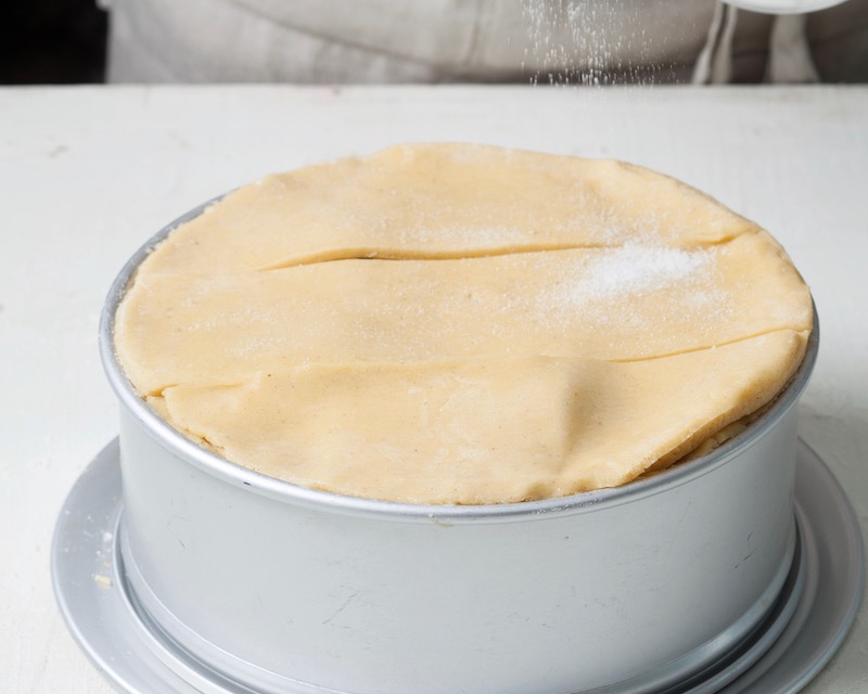 - Using a 9-inch cake pan or plate as a guide, cut a circle in center of rolled dough; gently transfer to prepared pan, pressing into bottom. (It’s OK if dough tears while transferring; gently move to pan, and press together.) Cut remaining rolled dough into 4 pieces; gently transfer to prepared pan, overlapping if needed and pressing all the way up sides and sealing any seams with bottom. Trim dough flush with top edge of pan; fill with cooled apple mixture.