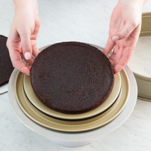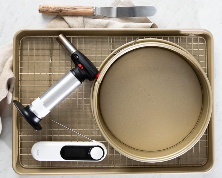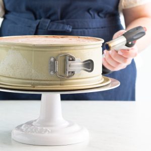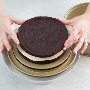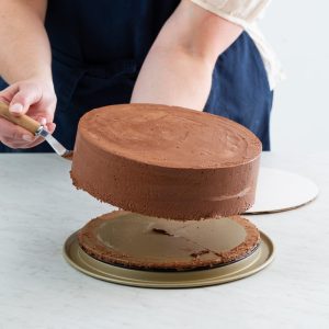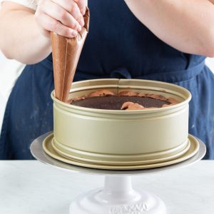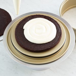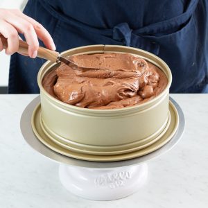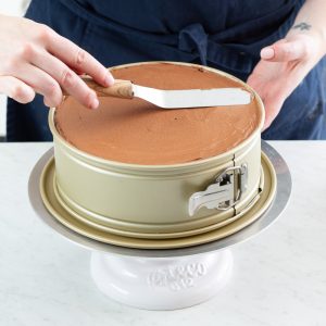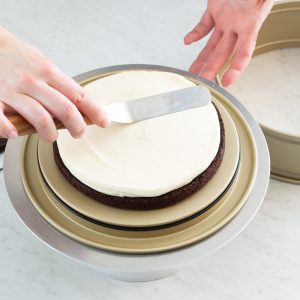Springform pan: A springform pan allows you to construct a multilayered cake without worrying about trying to turn it or lift it out of the pan, while also providing the necessary depth to hold all of the cake’s components and layers. The detachable sides make the transfer from pan to cake board much quicker and easier. We used Williams Sonoma’s Goldtouch® Pro Nonstick Leakproof Springform Cake Pan.