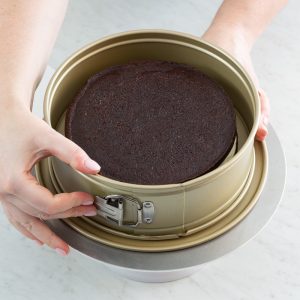 5. Level cooled cake layers, if desired. Place 1 cake layer in center on base of a 9-inch springform pan without sides. It’s very important that you place the cake layer in the center of the base of the springform so you have an even layer of the mousse on the outside of the cake.