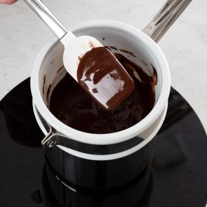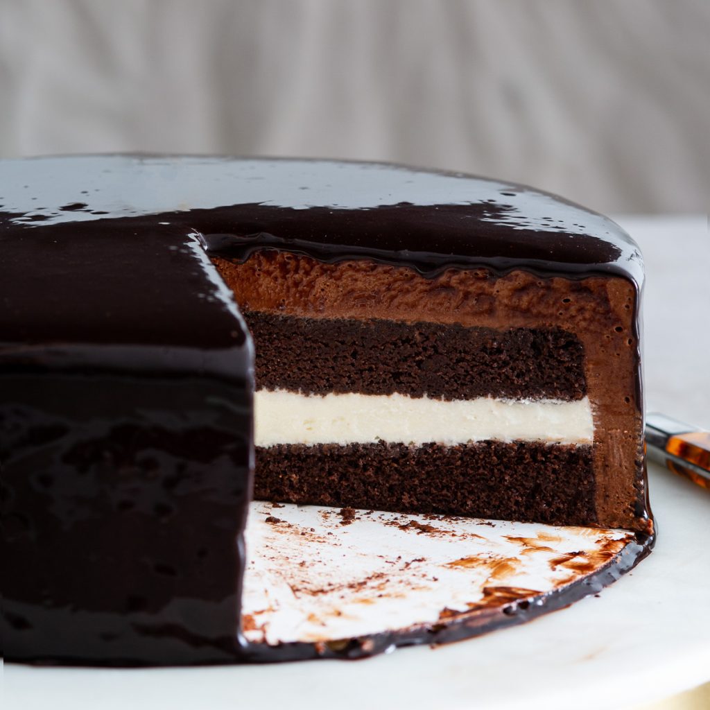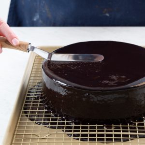 Perhaps the most temperamental element of this cake, mirror glaze is simple to make but relies upon exact temperatures and timing to achieve its signature glossy shine. For that reason, it’s important to move quickly and efficiently and make sure you have your cake ready to go once the mirror glaze reaches temperature.