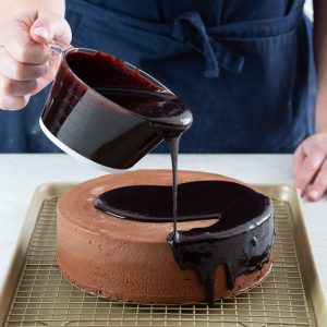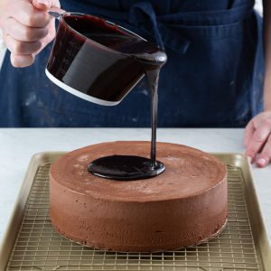 Now that the Chocolate Mirror Glaze is made, it’s time to let it shine as it enrobes your beautifully constructed Chocolate Mousse Cake