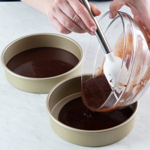 Though the cake batter may appear thin, this chocolate cake bakes up beautifully tender and moist and serves as the perfect base to our Triple-Chocolate Mousse Cake