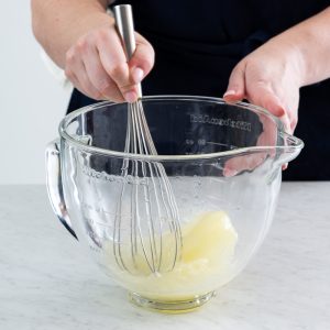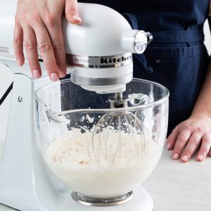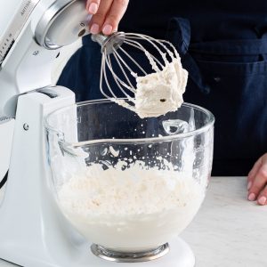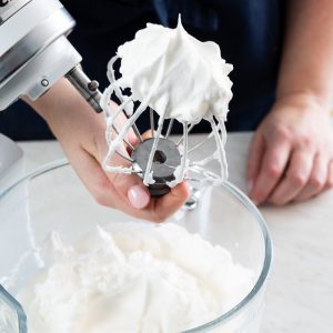 - Carefully return bowl to stand mixer. Using the whisk attachment, beat at medium-high speed until stiff peaks form.