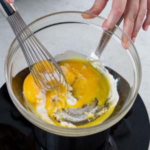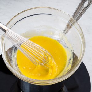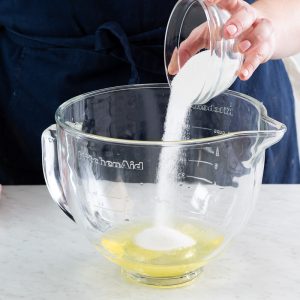 - In a large heatproof bowl over simmering water, place egg yolks and ¼ cup (50 grams) sugar. Cook, whisking frequently, until thickened and ribbon-consistency and an instant-read thermometer registers 158°F (70°C). Remove from heat, and set aside.