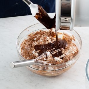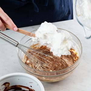 6. Using a balloon whisk, fold egg white mixture into egg yolk mixture in three additions alternately with chocolate mixture, beginning and ending with egg white mixture. Fold in whipped cream in two additions. Use immediately. With mousse, you want to keep as much of the air in the egg whites and whipped cream as you can. For that reason, it’s important to fold in both very gently and just until combined and a uniform consistency.