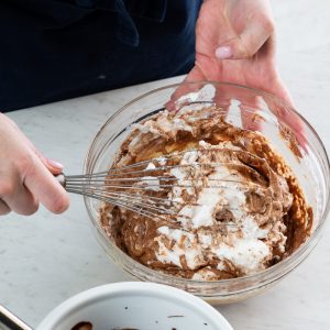 - Using a balloon whisk, fold egg white mixture into egg yolk mixture in three additions alternately with chocolate mixture, beginning and ending with egg white mixture. Fold in whipped cream in two additions. Use immediately.