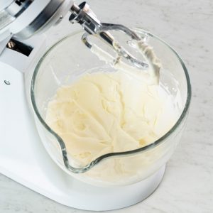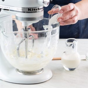 - In the bowl of a stand mixer fitted with the whisk attachment, beat cold cream and vanilla, slowly increasing mixer speed to medium-high, until stiff peaks form, about 2 minutes. Transfer to a medium bowl; cover and refrigerate until ready to use. Clean bowl of stand mixer and whisk.