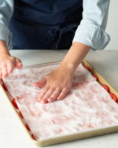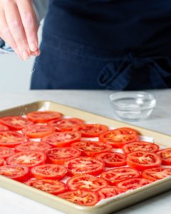 - Line baking sheets with paper towels. Place tomato slices on prepared pans; sprinkle with 1 teaspoon (3 grams) salt. Let stand at room temperature for 30 minutes; pat dry. Let stand for 30 minutes; pat dry.
