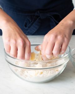 - In a large bowl, whisk together flour and salt. Add cold butter, tossing to coat. Using your fingers, cut in butter, flattening cubes into big shards and tossing butter through flour mixture to recoat, just until butter pieces are about nickel-size. Add cheese, tossing until evenly distributed. Make a well in center. Add ¼ cup (60 grams) ice water to flour mixture. Working one small section at a time, stir with a fork until mixture begins to become hydrated; start to gently knead dough together. (Don’t over-knead, as this will make the dough tough.) Add ice water, about 1 teaspoon (5 grams) at a time, until dough is properly hydrated. (Dough should be uniformly combined and hold together easily, but it won’t look totally smooth. Dough that is too dry may have sort of a “dusty” appearance or pockets of unhydrated flour; it will not hold together and will appear crumbly. Dough that is too wet will feel sticky or tacky to the touch and is often smoother and/or lighter in color.)