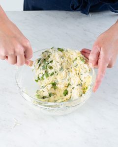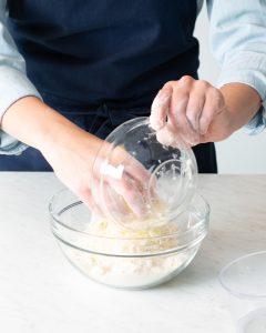 2. In a large bowl, whisk together flour and salt. Add cold butter, tossing to coat. Using your fingers, cut in butter, flattening cubes into big shards and tossing butter through flour mixture to recoat, just until butter pieces are about nickel-size. (You want to make sure the butter is well distributed before adding the liquid to prevent the butter from clumping together.) Add cheese, tossing until evenly distributed. Make a well in center. Add ¼ cup (60 grams) ice water to flour mixture. Working one small section at a time, stir with a fork until mixture begins to become hydrated; start to gently knead dough together. (Don’t over-knead, as this will make the dough tough.) Add ice water, about 1 teaspoon (5 grams) at a time, until dough is properly hydrated. (Dough should be uniformly combined and hold together easily, but it won’t look totally smooth. Dough that is too dry may have sort of a “dusty” appearance or pockets of unhydrated flour; it will not hold together and will appear crumbly. Dough that is too wet will feel sticky or tacky to the touch and is often smoother and/or lighter in color.)