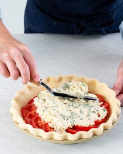 Cheesy All-Butter Pie Dough: Store-bought crusts simply can’t compare! “All-butter” means unparalleled flakiness and richness. And to enhance this crust’s delicious, buttery bite, we add Monterey Jack cheese for added salty, cheesy flavor. Balanced with the tang of fresh tomatoes and the creaminess of the filling, this pie dough is a savory showstopper.