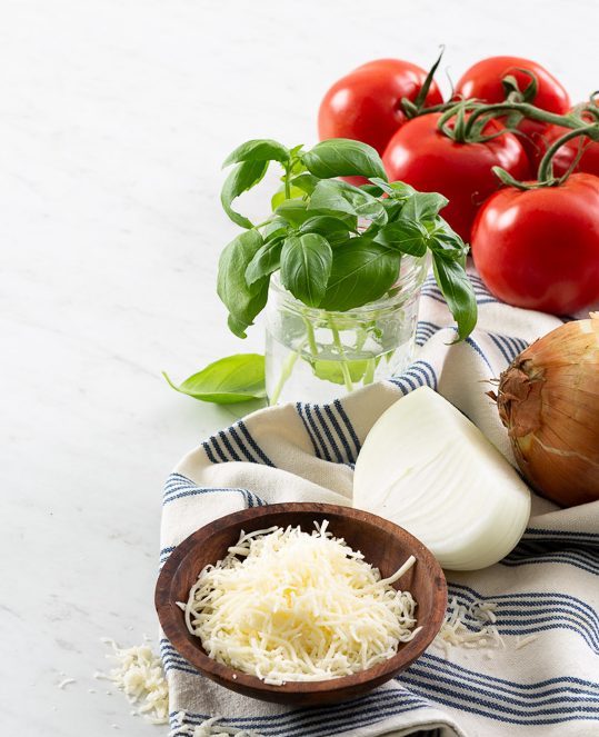 Fresh basil: Part of the Lamiaceae family, more commonly known as the mint family, fresh basil balances beautifully between sweet and savory, with notes of black pepper and anise. Whether you prefer sweet basil or Genovese, both work beautifully in this recipe. From caprese salad to margherita pizza to tomato pie, it’s clear that basil and tomato are a match made in heaven.