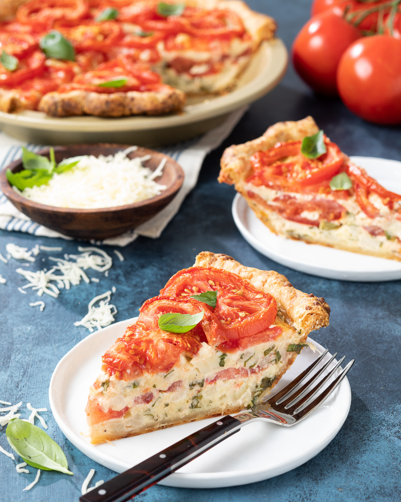 Summer sunshine yields some of the sweetest, juiciest tomatoes of the year, and this pie puts those bright slices of tomato front and center. Starting with a tender Cheesy All-Butter Pie Dough, layers of sliced fresh tomatoes and creamy, herby cheese filling are stacked inside to create a savory pie perfect for lunches, dinners, or even served as a shareable appetizer at your next summer gathering.