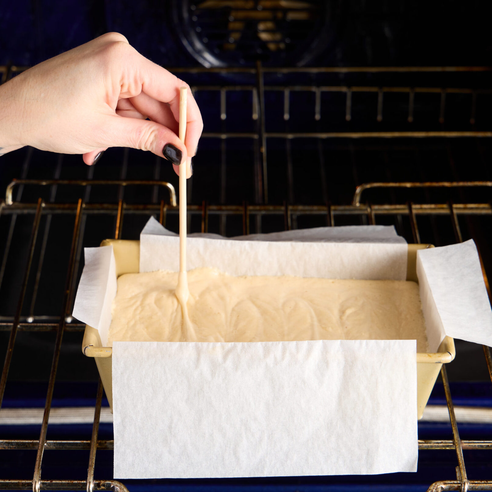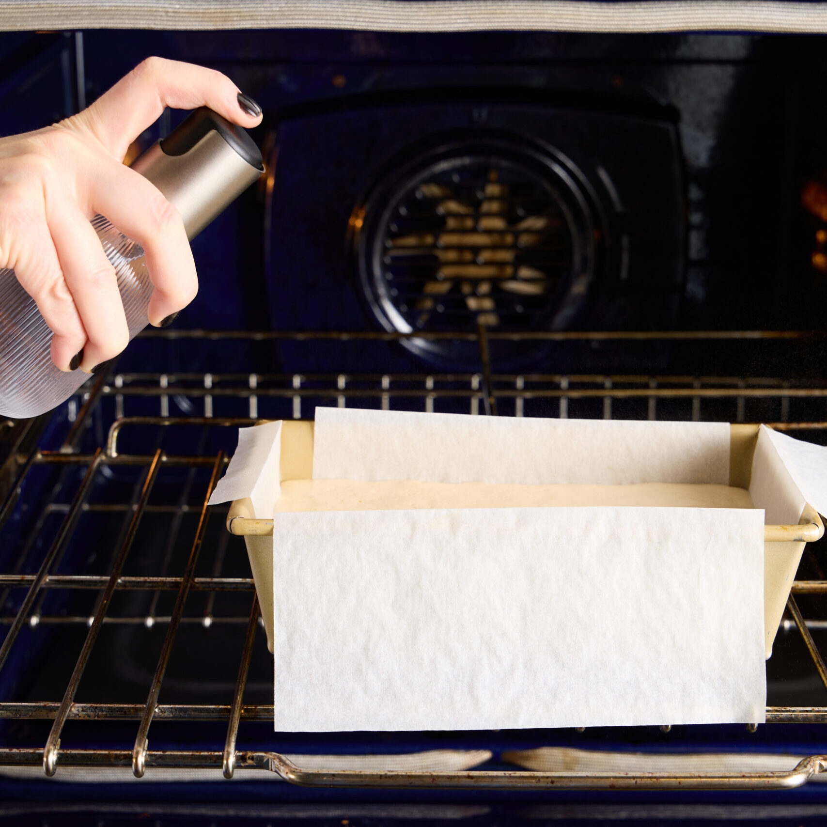 - Preheat oven to 325°F (170°C). Line a 9x5-inch loaf pan with parchment paper, letting excess extend over all sides of pan.