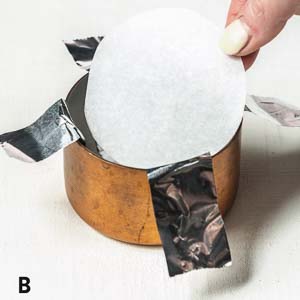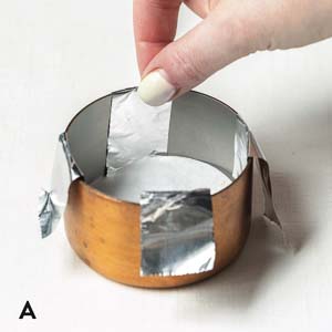 • Line 6 (1-cup) copper molds or 8-ounce ramekins with 2 (8- to 10-inch-long) 1-inch-wide strips of foil to make an “X,” letting excess extend over sides of molds (A). Line bottom of each mold with parchment paper (B).