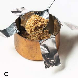 • In the work bowl of a food processor, pulse pretzels and pecans until finely chopped and well combined. In a medium bowl, stir together pretzel mixture, sugar, and melted butter until well combined and mixture holds together when lightly pressed. Divide mixture among prepared molds (about 2 tablespoons or 28 grams each). Press firmly into an even layer (C). Place molds on a rimmed baking sheet.
