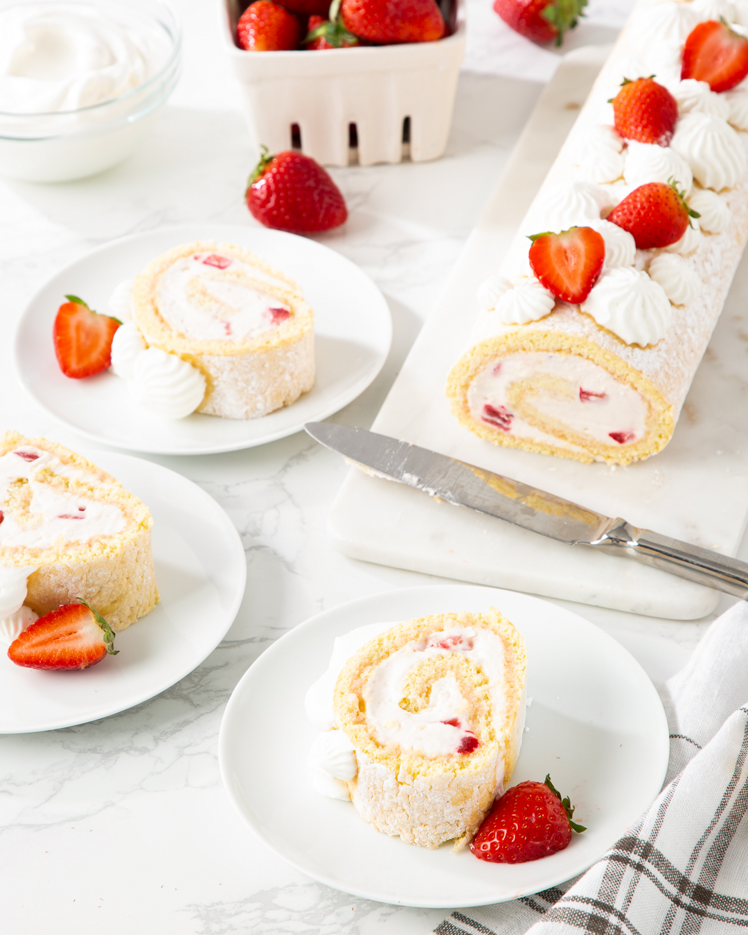With a guaranteed one-to-one ratio of delicious sponge to filling, this Strawberry Roulade is a cake lover’s dream. A simple Strawberry Sauce made from juicy ripe strawberries is the secret weapon for delicious simple syrup and Strawberry Cream Cheese Filling. To create the picture-perfect finish, the light-as-air genoise envelopes the creamy filling, creating a pink-hued swirl.