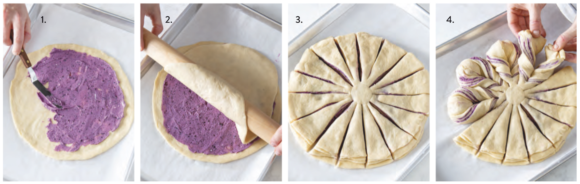- Lightly punch down dough; cover and let stand for 5 minutes. Turn out dough, and divide into 4 portions (about 200 grams each); gently shape each into a ball. Cover with plastic wrap, and let stand for 15 minutes. Keeping other portions covered with plastic wrap, roll and pat 1 portion into an 11-inch circle; gently place on prepared pan. (Dough may shrink slightly.) Spread one-third of cream cheese mixture (about 3½ tablespoons [55 grams]) onto dough circle, leaving a ½-inch border. Repeat procedure twice. Roll remaining dough portion into an 11-inch circle, and place on top of previous layers.