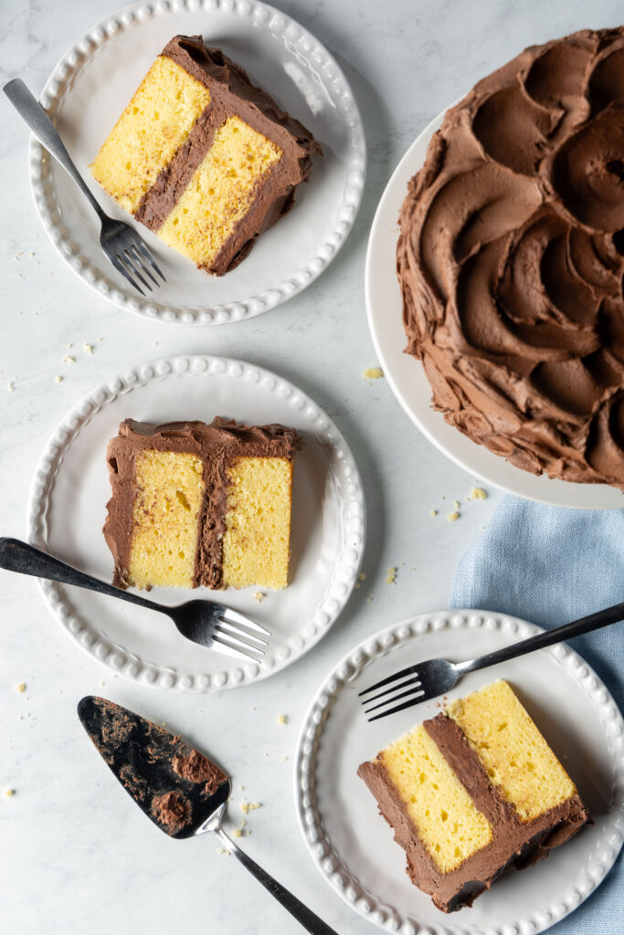 Our yellow cake is rich, buttery, and moist thanks to the use of butter and oil, and tender and light due to cake flour. It’s sturdy enough to layer confidently but maintains its fluffy, airy crumb. The only thing that makes this cake better is a generous layer of indulgently decadent chocolate buttercream frosting.