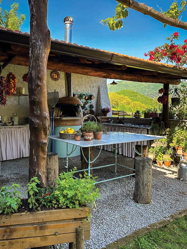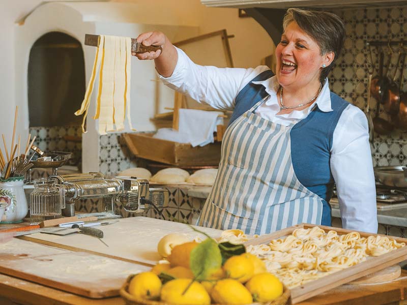 Tucked high between mountains in the Pietre commune of the Amalfi Coast countryside, Felicia’s Home Restaurant is not a traditional restaurant but an invitation to cook alongside Felicia in her 17th-century farmhouse, Casale De Vivo, where she grew up. Arriving here will literally take your breath away as your eyes try to take in the beauty. As you wind past the garden and enter a courtyard, roses climb the home’s patinaed stone walls, grapevines creep along a trellis that shades a beautifully set farm table, aprons flutter in the breeze from a clothesline, and an outdoor kitchen built around a wood-fired pizza oven gives way to stunning mountain views.