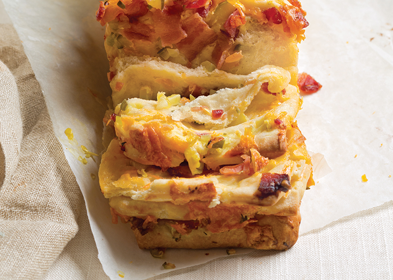 - Roll dough into an 18x16-inch rectangle. Brush with 2 tablespoons (28 grams) melted butter, and sprinkle with bacon, Cheddar, and pickles. Using a knife or pizza wheel, slice dough lengthwise into 4 equal strips. Stack strips one on top of the other, and cut into 4x3-inch rectangles.