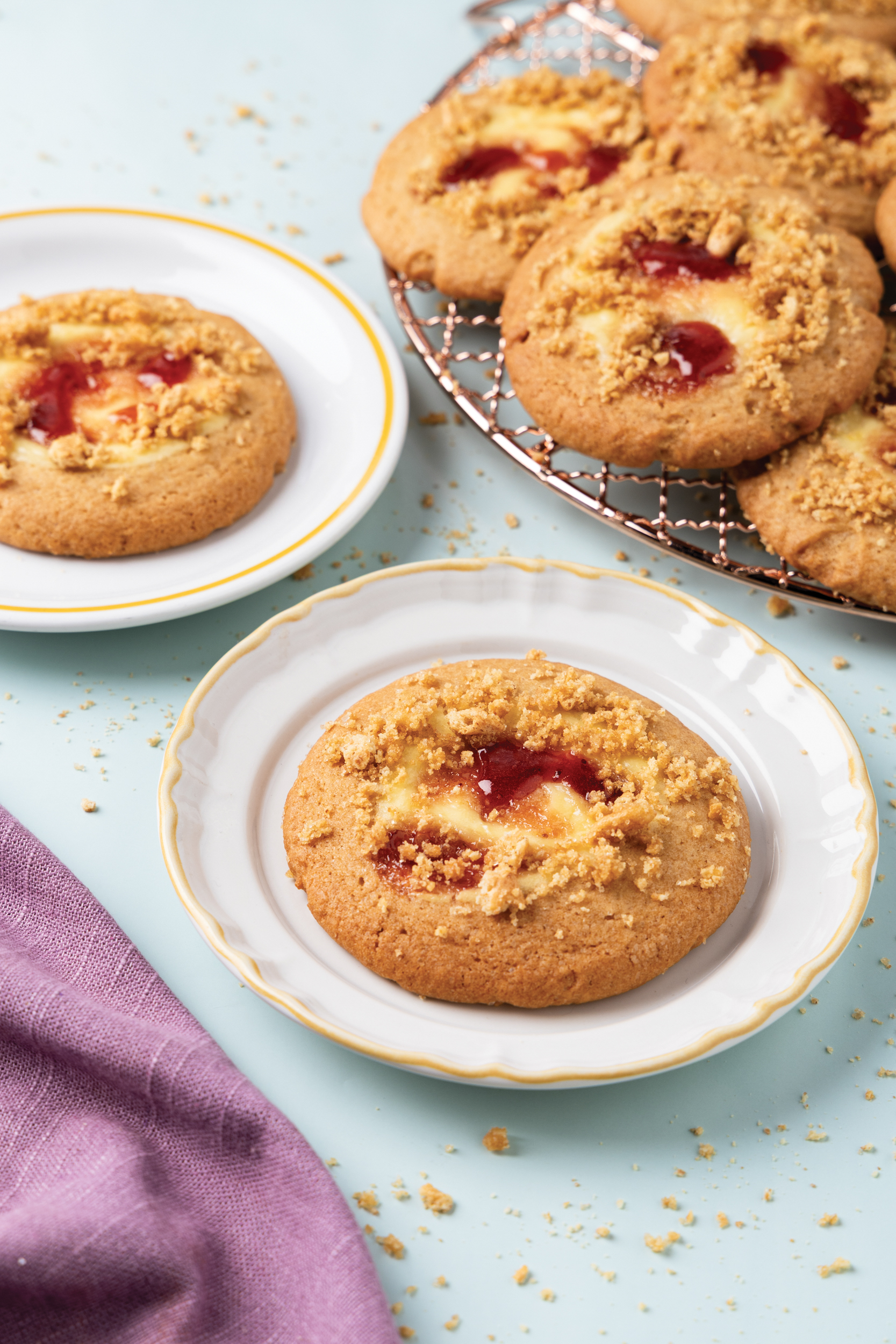 We created a cookie that emulates the defining flavors of New York-style cheesecake: warm and buttery graham cracker crust, rich and smooth cream cheese filling, and tangy and fresh strawberry sauce. No special pan, no long wait to indulge, and no sharing required!