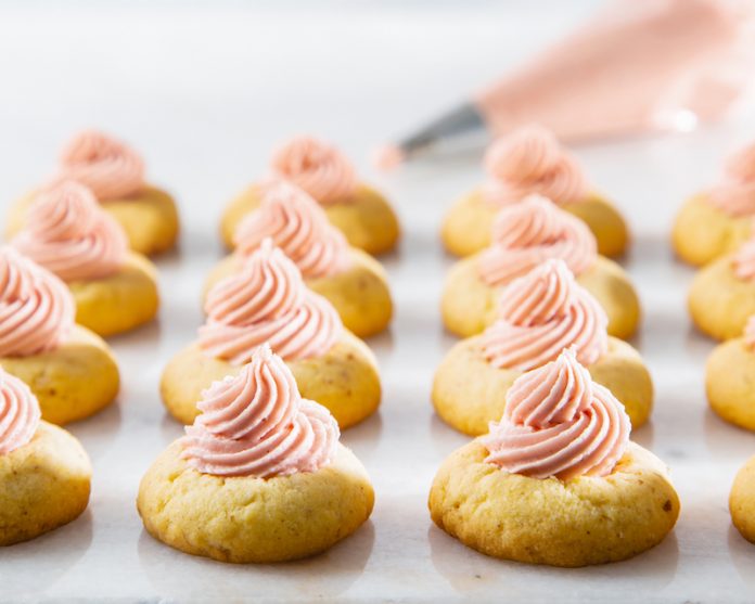 - Bake until bottoms are golden brown, 15 to 17 minutes. Remove from oven, and press down centers again. Let cool on pans for 10 minutes. Remove from pans, and let cool completely on wire racks. Place Cherry Buttercream in a piping bag fitted with a medium open star tip (Wilton #32). Pipe Cherry Buttercream into center of each cookie.