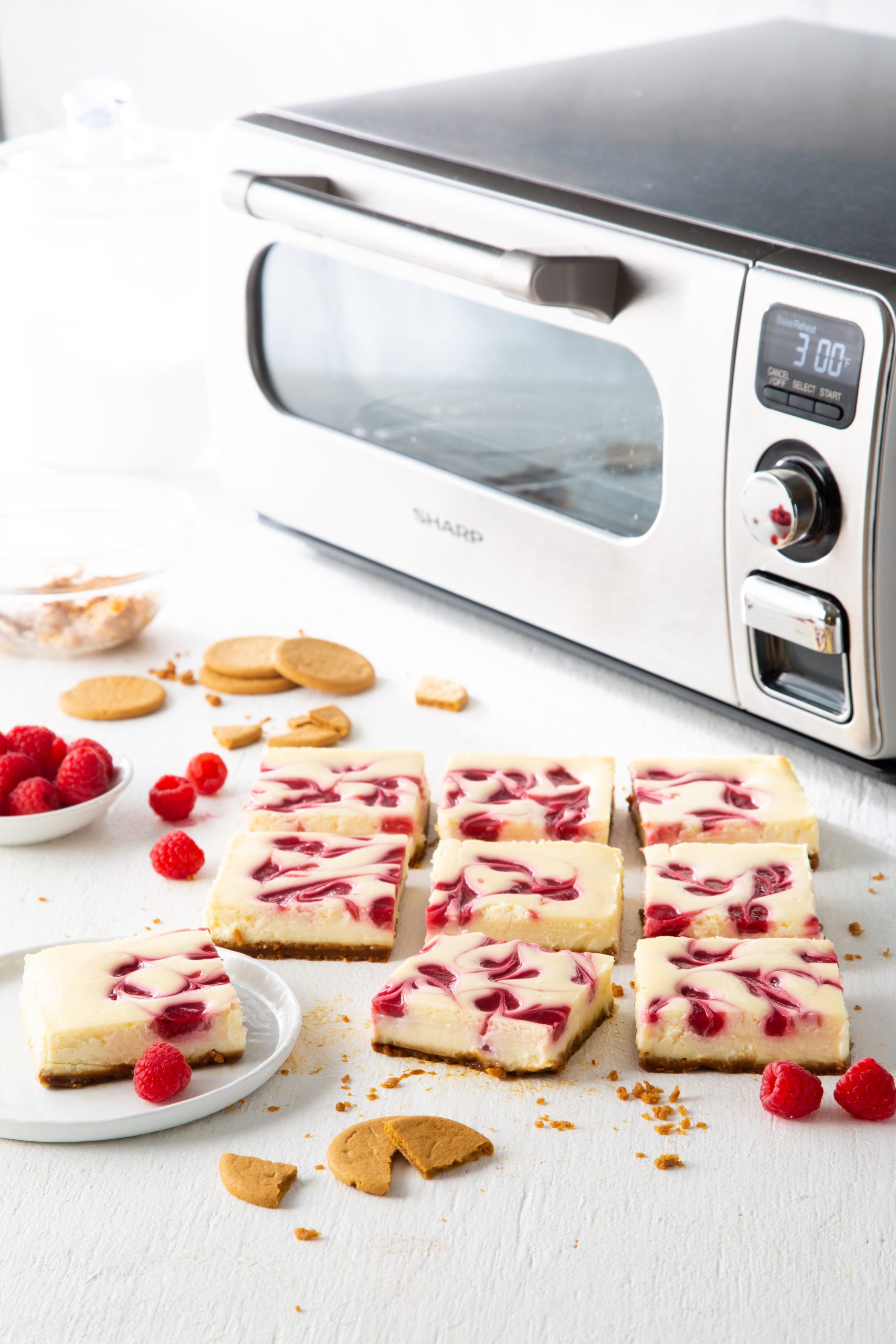 Baking these festive raspberry-swirled bars within the revolutionary SHARP® SuperSteam+ Built-In Wall Oven or Sharp Superheated Steam Countertop oven makes the cheesecake texture especially velvety and smooth.