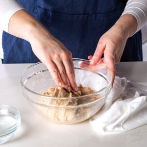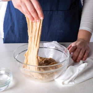 At this time, the starter is beginning to feed on the new flour in the dough. Folding the dough builds strength through the bulk fermentation process by doing a series of folds. Keep a small bowl of water next to you; wetting your hands periodically will keep the dough from sticking to your hands.