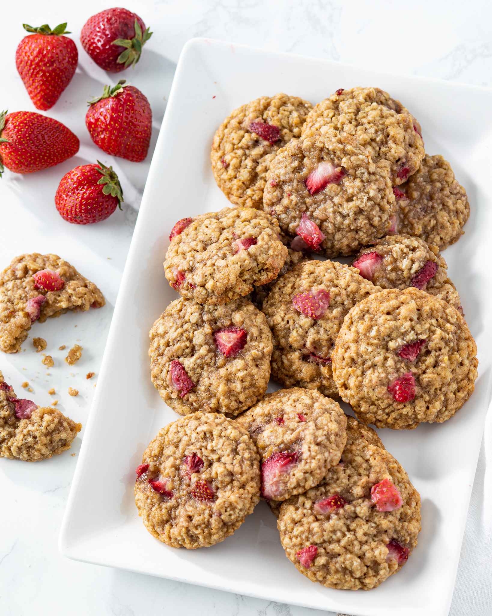 - In a medium bowl, whisk together flours, baking soda, salt, and cinnamon. Add flour mixture to oil mixture all at once; beat at medium-low speed until nearly combined, stopping to scrape sides of bowl. Add oats; beat just until combined. Gently fold in strawberries. Using a 1½-tablespoon spring-loaded scoop, scoop dough (about 28 grams each), and place at least 1½ inches apart on prepared pans.
