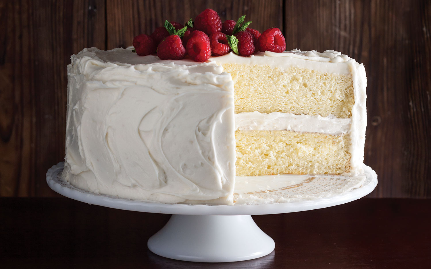 - Bake until a wooden pick inserted in center comes out clean, about 30 minutes. Let cool in pans for 10 minutes. Remove from pans, and let cool completely on wire racks. Spread Vanilla Frosting between layers and on top and sides of cake. Garnish with raspberries and mint, if desired.