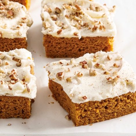 - Bake until a wooden pick inserted in center comes out clean, 25 to 30 minutes. Let cool completely in pan. Spread Pumpkin Spice Cream Cheese Frosting in an even layer on top of cooled bars. Cover and refrigerate until frosting is set, at least 30 minutes. Using excess parchment as handles, remove from pan, and cut into bars. Garnish with cinnamon and pecans, if desired.